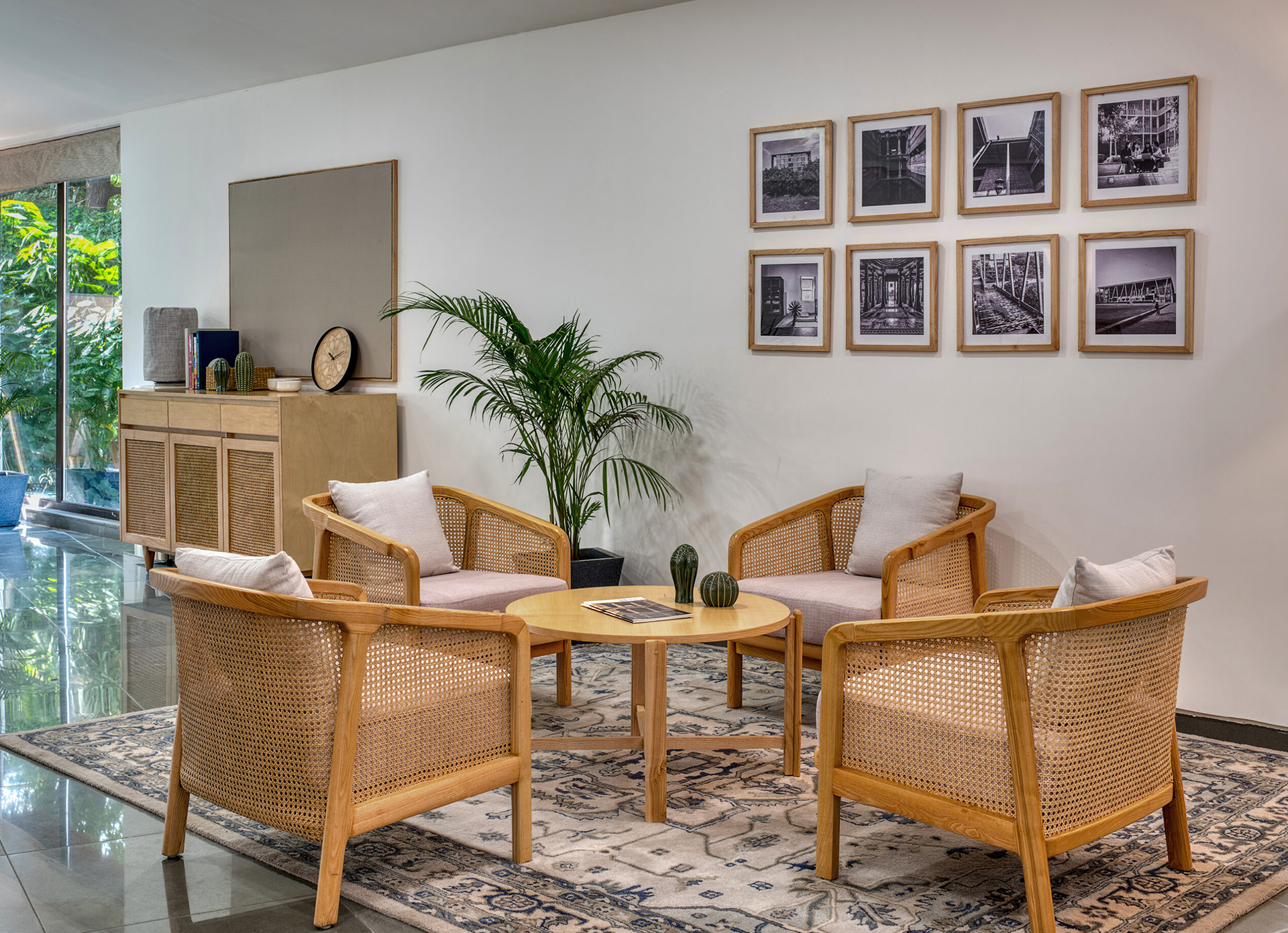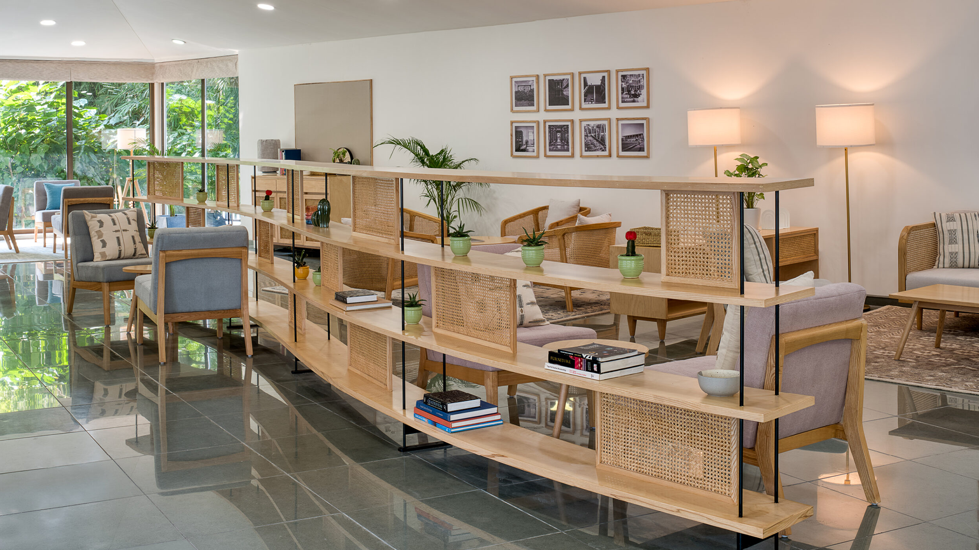 A low bookshelf, designed as a ‘swish’ along the center of the space, acts as a porous divider of the trapezoidal space. The hand-knotted rugs, woven cane detailing and hand-woven cushion covers were selected to enhance the crafted experience of the space.