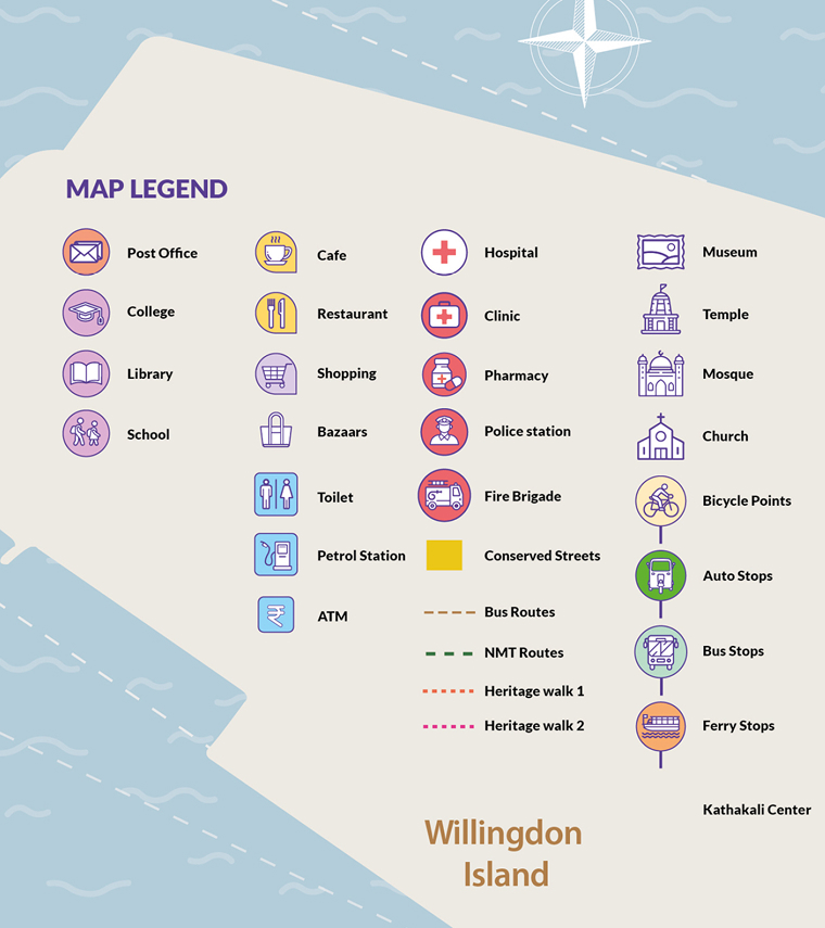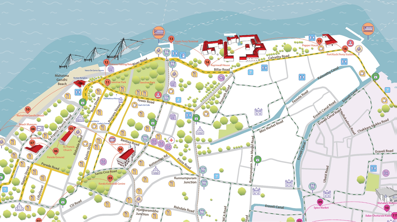 An illustrated and engaging map of the Fot Kochi area showcasing amenities